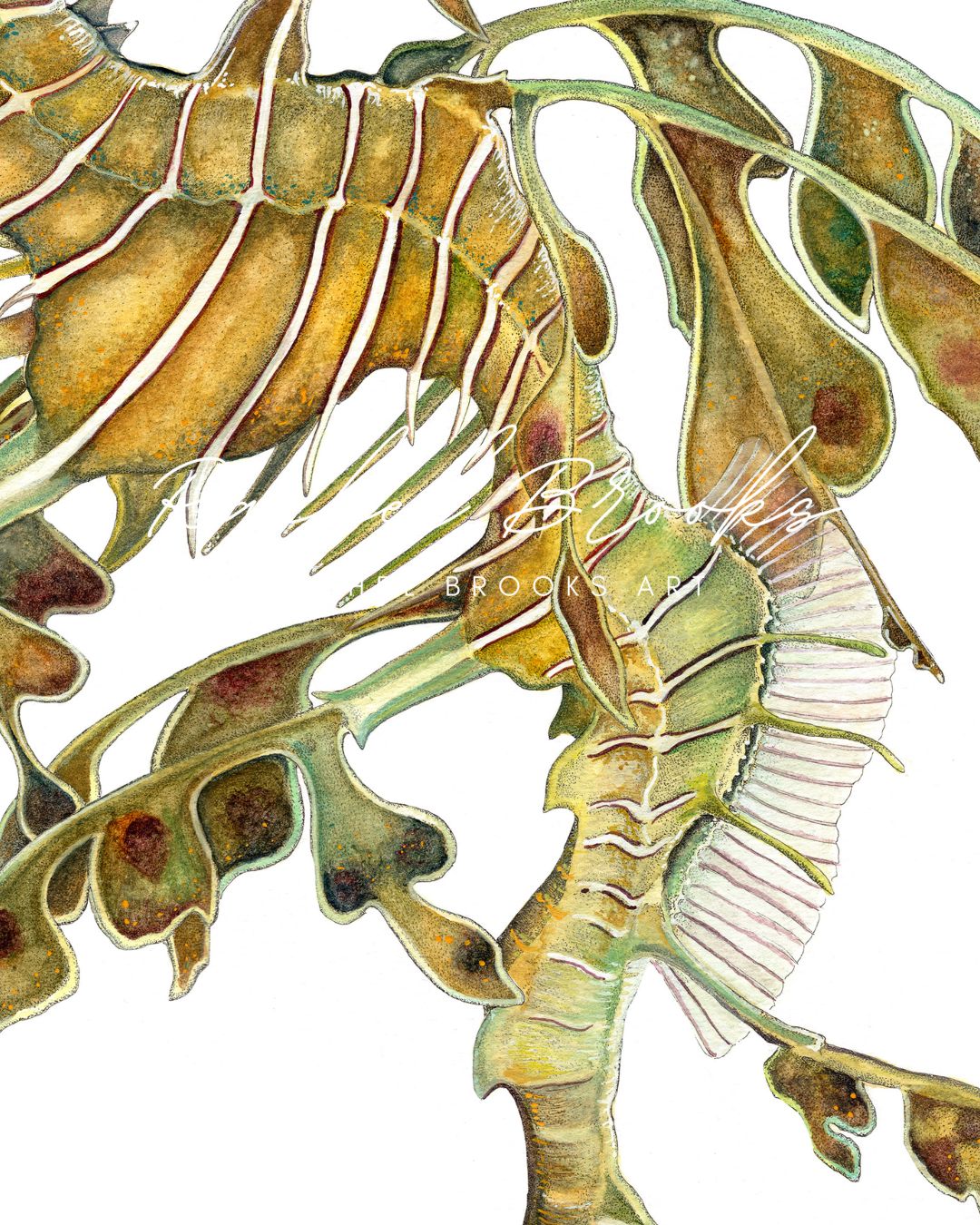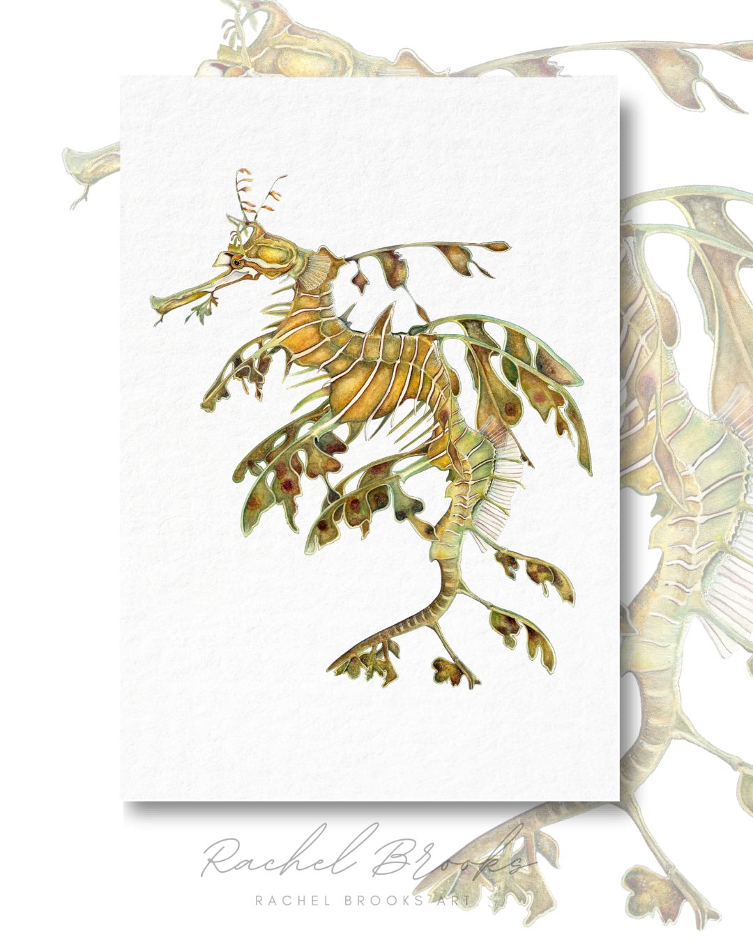 An art print of the beautiful leafy sea dragon , Phycodurus eques. Ocean-inspired original artworks by internationally selling marine wildlife artist, Rachel Brooks. This scientific illustration features the Leafy seadragon. Each original drawing has been meticulously drawn in archival pigment ink and embellished with watercolour and gouache in Rachel's signature style.