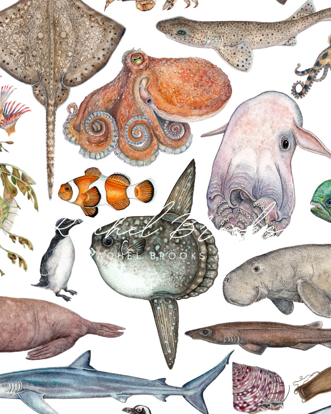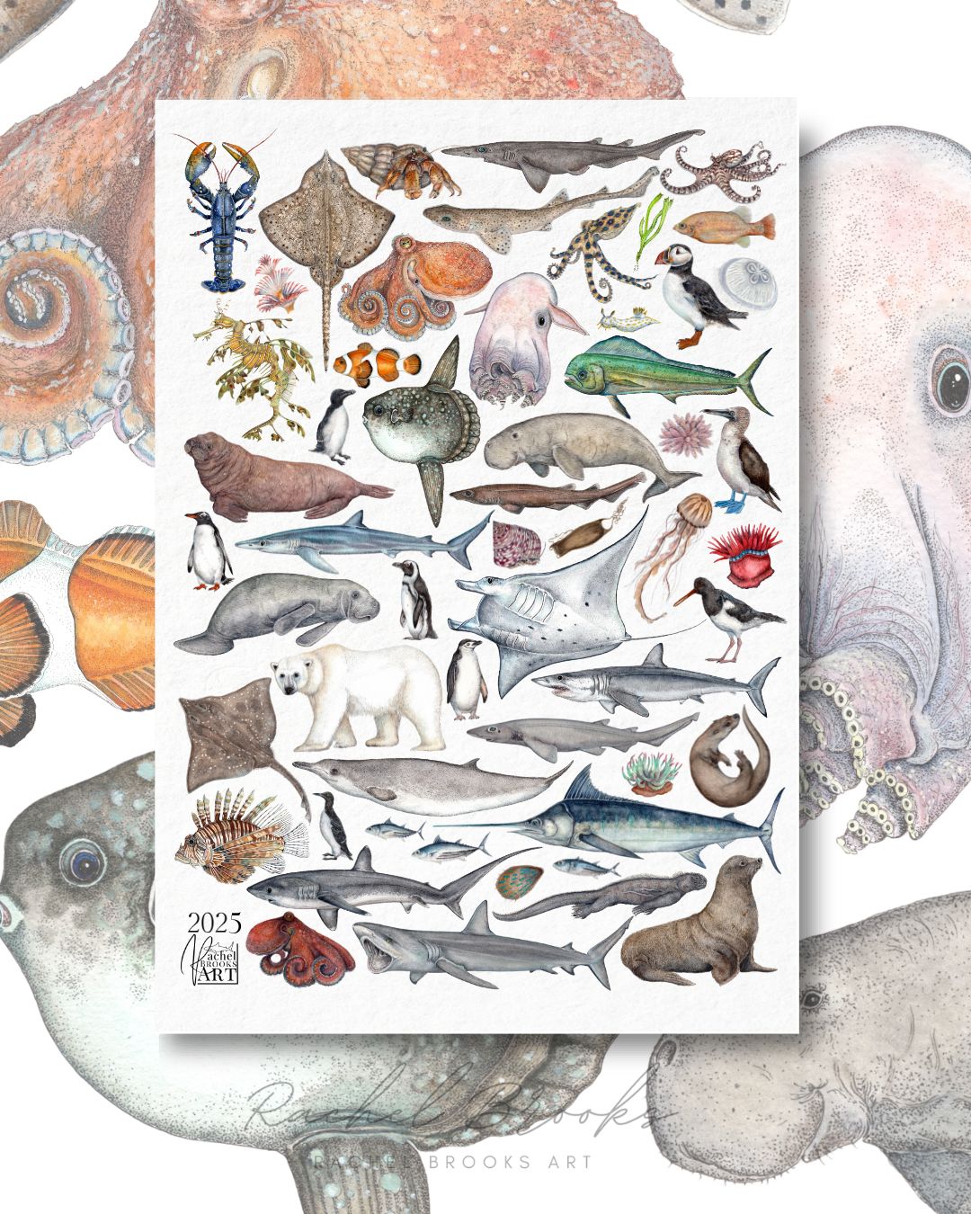 Ocean and natural world inspired original artworks by internationally selling marine wildlife artist, Rachel Brooks. This Giclée fine art print features all the marine species I created in 2025, tuna, playful seals, and giant whales. Meticulously drawn in archival pigment ink and embellished with watercolour and gouache in Rachel's signature style.