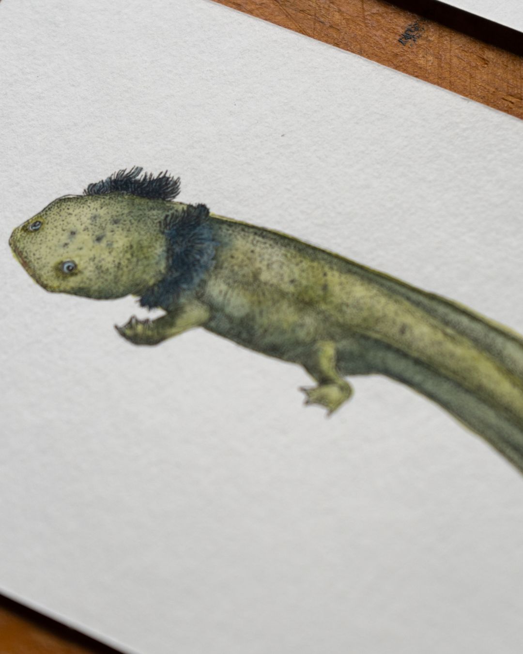 Nature-inspired original artworks by internationally selling marine wildlife artist, Rachel Brooks. This scientific illustration features the Lake Patzcuaro salamander, Ambystoma dumerilii